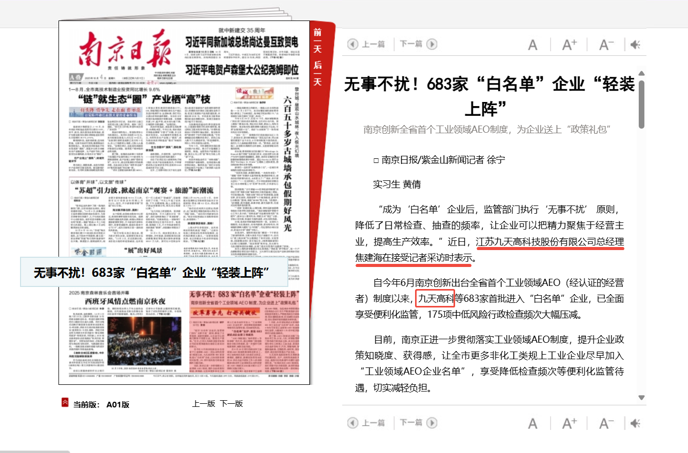 无事不扰!九天高科入选 AEO 制度“白名单”